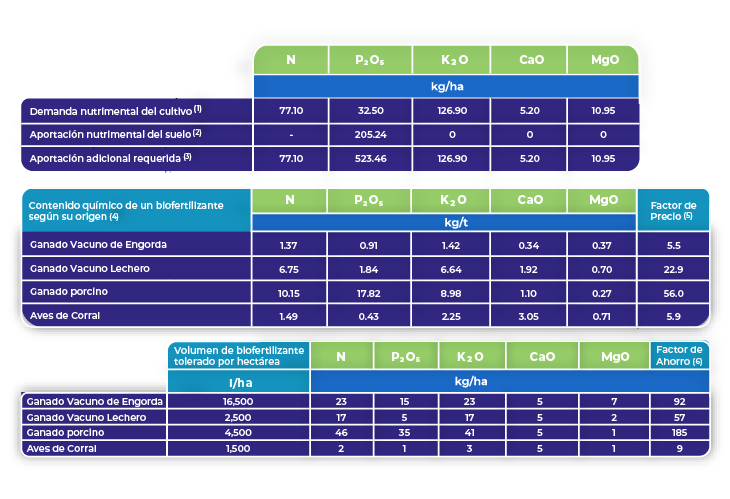 General: Los valores aquí mostrados son una guía y no deben tomarse como recomendación para un plan de fertilización. Un servicio profesional que caracterice suelos, cultivo y biofertilizantes es necesario para hacer un plan de fertilización de acuerdo a sus necesidades específicas.