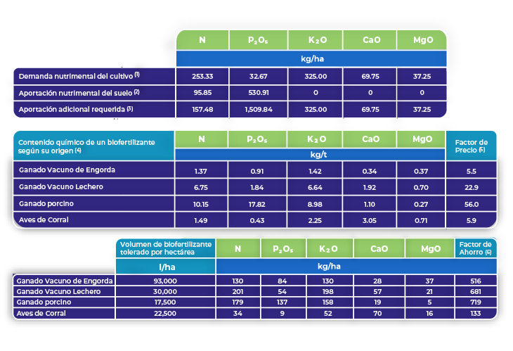 General: Los valores aquí mostrados son una guía y no deben tomarse como recomendación para un plan de fertilización. Un servicio profesional que caracterice suelos, cultivo y biofertilizantes es necesario para hacer un plan de fertilización de acuerdo a sus necesidades específicas.