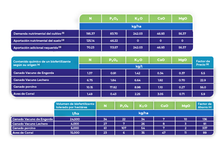 General: Los valores aquí mostrados son una guía y no deben tomarse como recomendación para un plan de fertilización. Un servicio profesional que caracterice suelos, cultivo y biofertilizantes es necesario para hacer un plan de fertilización de acuerdo a sus necesidades específicas.